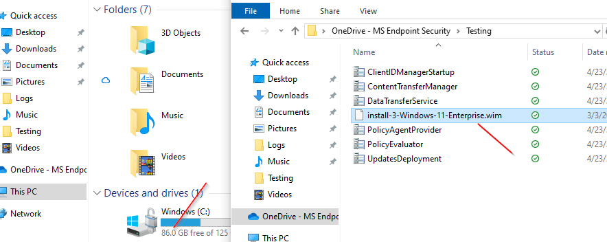 As an example, I copied a full Windows 11 WIM file to my OneDrive and waited for it to sync locally. As shown below, after syncing the WIM, my available disk space dropped to 86GB.